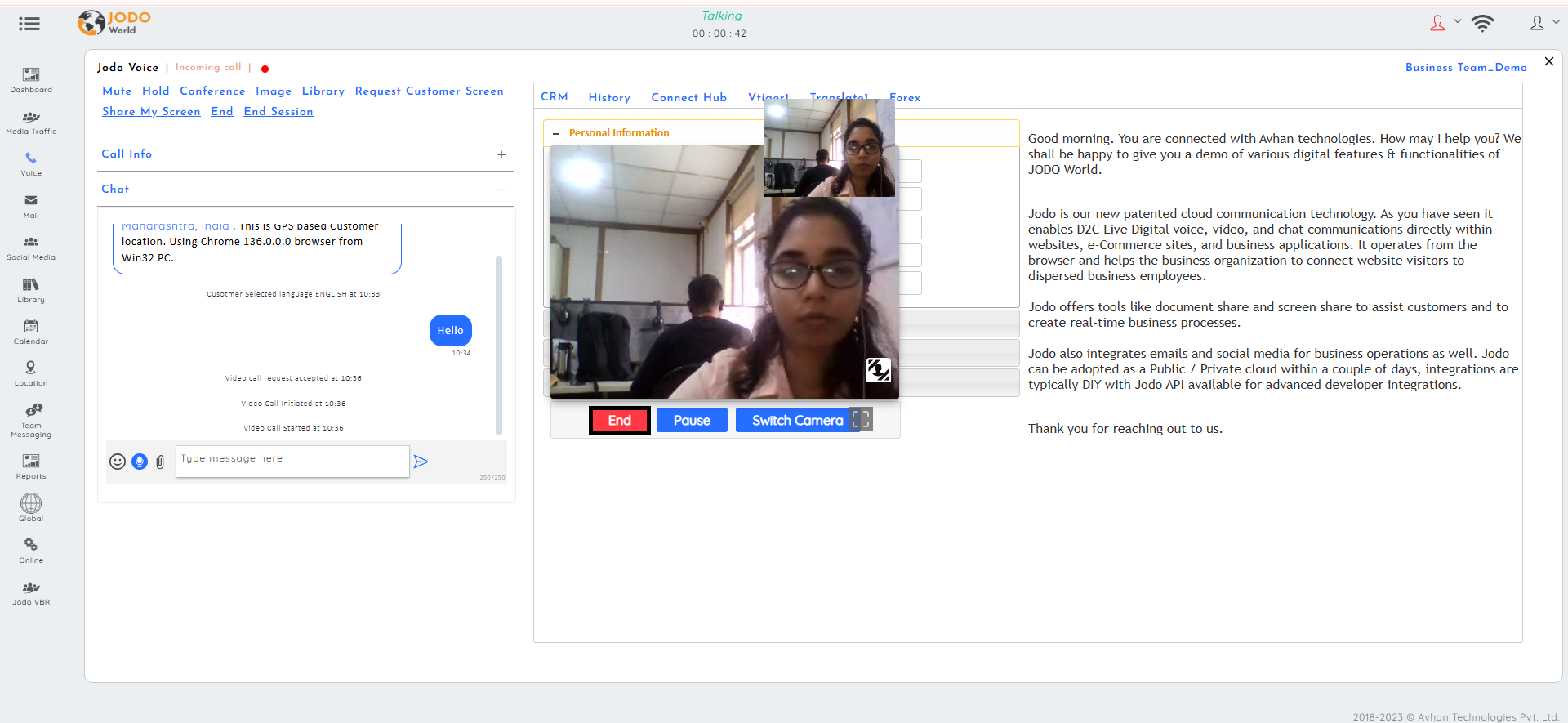 Jodo Toolbar Video Call Author: Omkar Adivarekar 1103 views To start a video call with a customer, click on the Video button as shown below. A request to accept the Video call is then sent to the customer. After the customer accepts the request, following request comes to user to proceed with the video call. Following window will be displayed, once the video call is initiated. User have the option to pause the video by clicking on the “Pause” button.Selecting “Pause” will hide user video screen from the other end.Then window will look as shown in picture below.To resume the video, simply click on the “Resume” option. If you want to end the video call, simply click on “End” option. Need Help ? How can we help? Was this page helpful? Yes No How can we help? Jodo Help Desk with an integrated Knowledge Base, Send